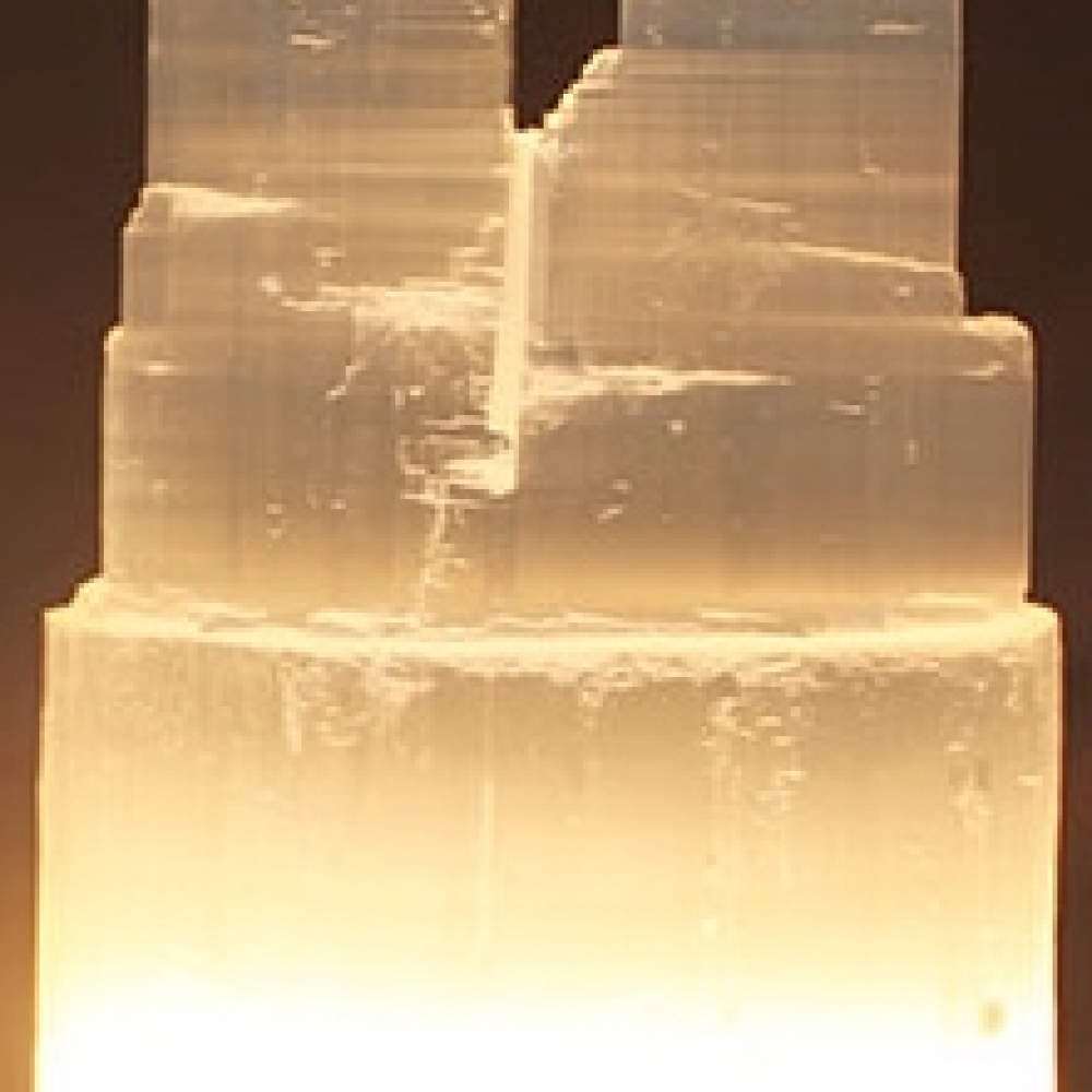 Selenite is often known as the light bringer, due to its linear crystal structure it behaves like a natural fiber optic. If any light is shone through the material it is transmitted down the full length of the crystal. This is a physical manifestation of its metaphysical properties. Selenite could be considered as the sword of awareness cutting through assumptions and promoting re-connection between the conscious self and the inner mystic. Selenite allows direction of energy into the body and energy system to remove blockages which result in disease . Selenite and Apophyllite are the only two minerals powerful enough to clear negative energies out of Quartz Crystals. Selenite is further unique in that it is the only mineral capable of programming Quartz Crystals. Place any crystal, specimen or pocket stone you have been working with on top of your Selenite lamp or wand or stick. You can set a number of different stones in a row. The Selenite will both clean any energies present and recharge your other crystals and stones. You can greatly increase any other crystal or stone energy by pointing your Selenite Wand at the other stone. Reprogramming is done this way. Just visualize how you want the energy of your Quartz crystal or other stone to perform. Spirit Guides, Angels, Higher Beings or Totem Animals can all be more easily contacted using a Selenite Wand. Access your subconscious as well. These wands are very potent. Rub your Selenite in an outward direction with two or three fingers. At the same time visualize and ask to contact a guide. Selenite provides a bridge to other worlds. Selenite is often used for clarity of mental processes. It was the original record keeping stone in Atlantean and Lemurian times. Using the same rubbing technique as for Past Lives, ask your Selenite for passage to particular areas of knowledge. Many times that knowledge is given to you in dreaming or while astral traveling. When using your Selenite Wand in any of these ways or to amplify healing, make certain you use your inner powers to wipe clean the energy that has been placed into the Selenite. Superior for psychic development and intuitive processes. A growing number of readers are finding Selenite more useful and manageable than Quartz Crystal. Quartz has that uncompromising habit of amplifying everything, positive or negative. As a bridge to altered states of consciousness, Selenite is an excellent tool for visualization, meditation and working with the subconscious. Selenite Goes to the source of physical disorders and provides insights into probable causes. Outstanding as a journeying tool for Shamans. Its unique ability to connect and balance the Spiritual and Physical bodies enables Selenite to do similar work between two persons. Working with the subtle bodies Selenite pushes one to the area most in need of clearing and balancing. Its power in working with all of the chakras makes Selenite a universal healing implement. Selenite is not like any other healing stone or wand that focuses its particular energy on a problem. Selenite works like a tuner on a radio to discover locations of static in the aura. As your own awareness grows so will your use of this mystical mineral. Because of this ability to flow light into all situations coupled with its physical structure it is an ideal wand making material. The energy flow is an ideal carrier of the energies of other crystals added to the wands.SELENITE LAMPS are great tools for clearing negativity, for stress relief, mood elevation and for energizing all other healing stones and your surroundings.